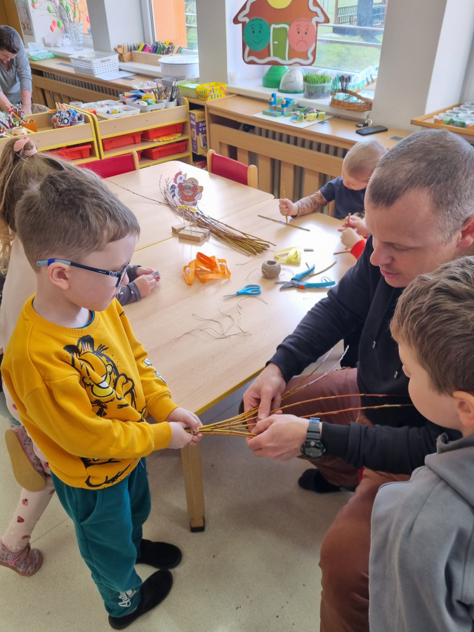 Díky návštěvě jednoho tatínka si kluci i holky mohli vyzkoušet celou práci vlastníma rukama. Pomáhali počítat proutky, drželi je při pletení a aktivně asistovali. Některé dovednosti, které se tradičně předávají z otce na syna, teď děti prožívaly samy.