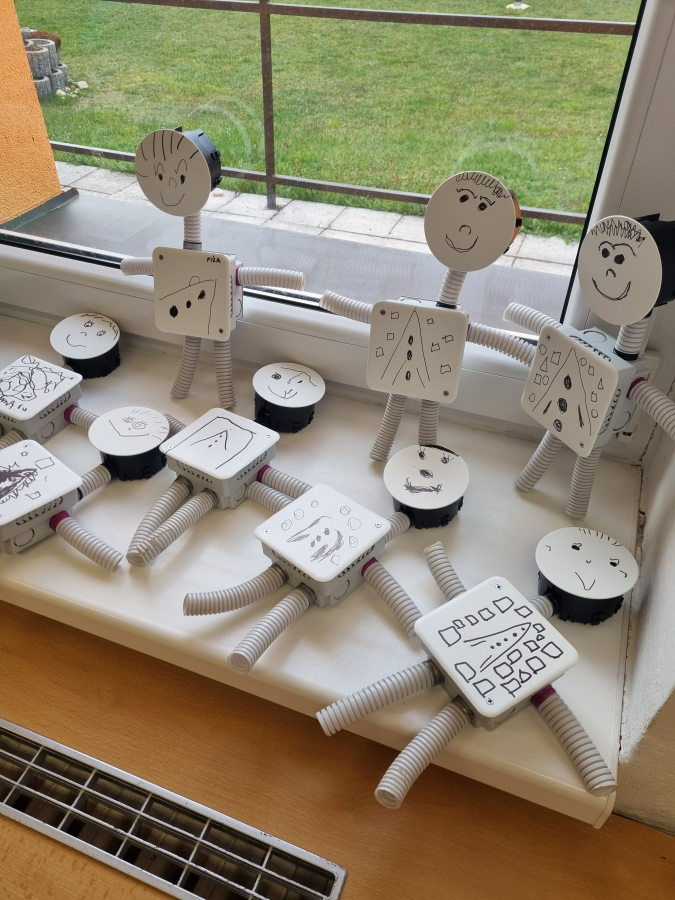 Největší radost jim přinesla samotná výroba vlastních robůtků. Děti pracovaly s různými materiály a vytvářely originální postavičky. Každý robot byl jedinečný – měl svůj výraz, ozdoby i „schopnosti“. S nadšením kreslily obličeje, zdobily těla. Celý den se nesl v příjemné atmosféře plné radosti, spolupráce a tvořivosti.